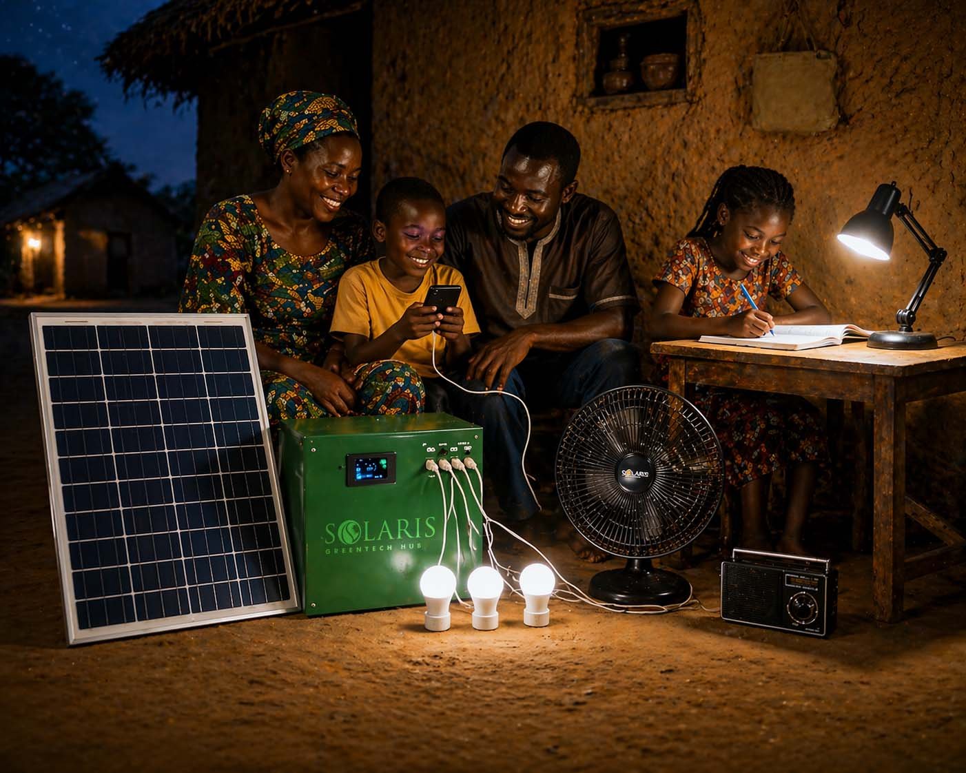 A family in a rural area can purchase a Solaris micro solar kit to power essential household items. This kit typically includes solar panels, a battery, and LED lights, allowing them to light their home, charge mobile devices, and run small appliances like fans or radios. This setup significantly improves their quality of life by providing reliable electricity and reducing dependency on kerosene lamps or diesel generators.